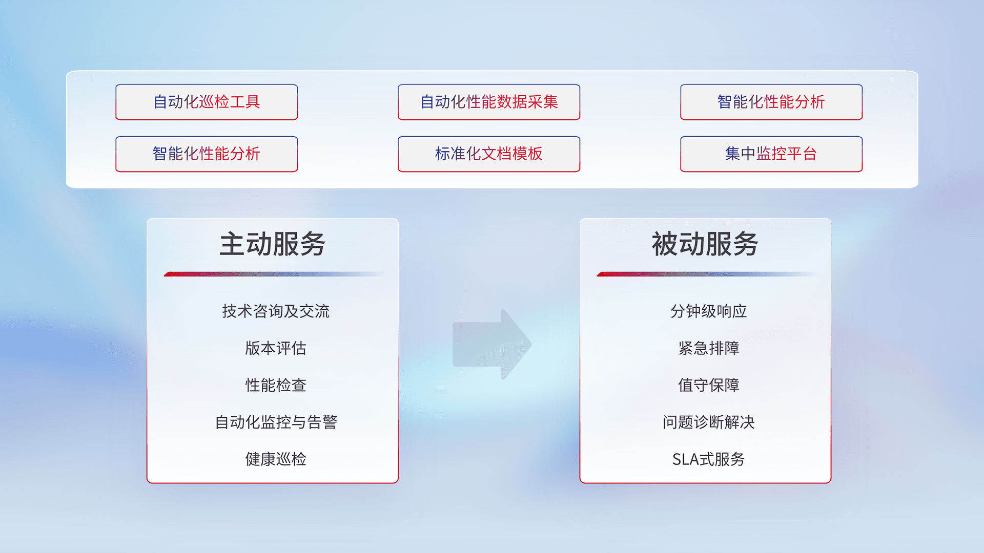 智能化工具和标准化文档,,,,保障服务质量,,提供主动服务(包含技术咨询、、、、版本评估、、、、性能检查、、、、自动化监控与告警、、、健康巡检)和被动服务包含(分钟级响应、、紧急排障、、、、值守保障、、、问题诊断解决、、、SLA服务)。。。。